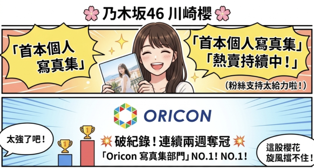 乃木坂 46 的人氣成員川崎櫻(川﨑桜)首本個人寫真集持續展現強勁的市場號召力。根據日本最具影響力的音樂與書籍排行榜 Oricon(公信榜) 最新數據顯示,該作品在發售後的第二週依然穩坐「寫真集部門」冠軍寶座,達成罕見的連續兩週奪冠壯舉,成為當前演藝圈最受關注的焦點。