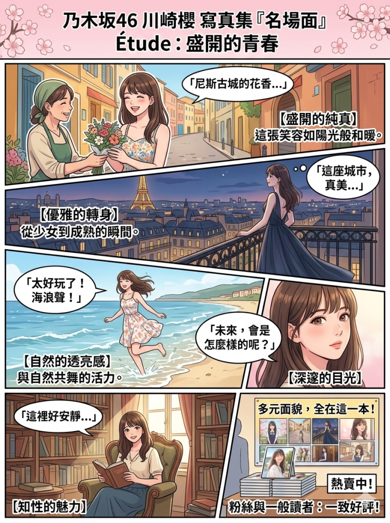 這本寫真集以「盛開的青春」為主題,遠赴海外取景,收錄了川崎櫻從清純可人的少女氣息到逐漸展現成熟魅力的多元面貌。其溫柔如櫻花般的笑容與透亮感,不僅讓忠實粉絲(Ohisama)大力支持,更憑藉優質的影像水準吸引了大量一般讀者的關注。
