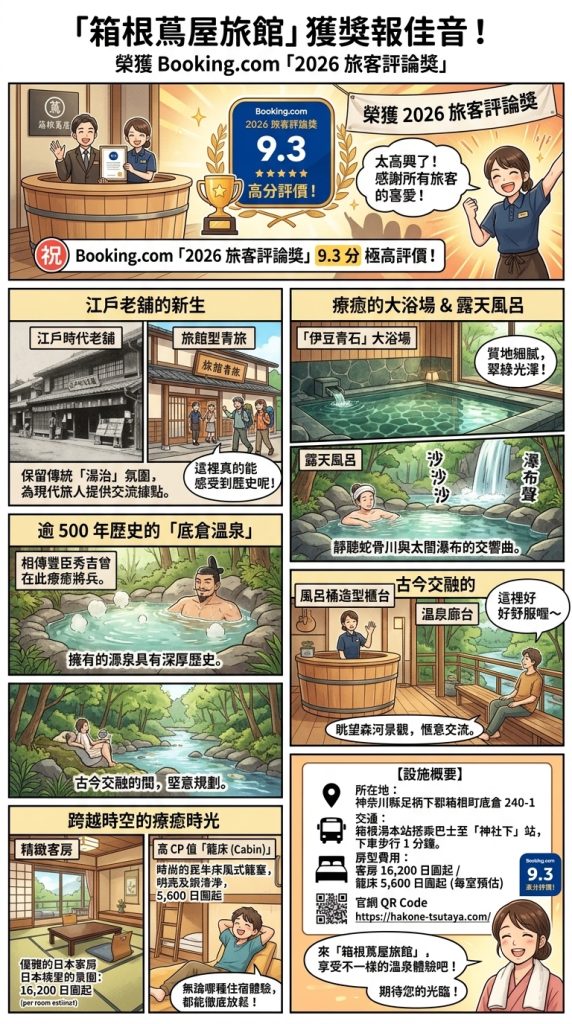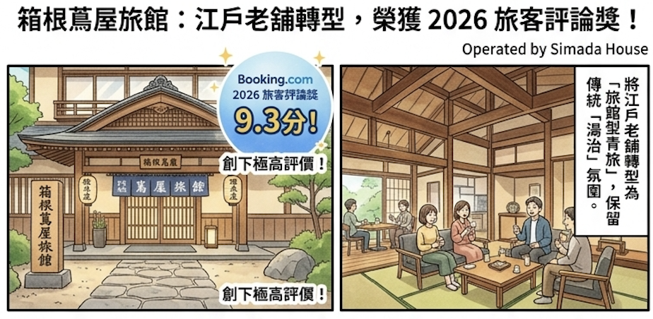 由 Simada House 運營的「箱根蔦屋旅館」傳報佳音,再度榮獲 Booking.com「2026 旅客評論獎」,並創下 9.3 分的極高評價。這間將江戶老舖轉型為「旅館型青旅」的空間,成功在保留傳統「湯治」氛圍的同時,為現代旅人提供極具質感的交流據點。