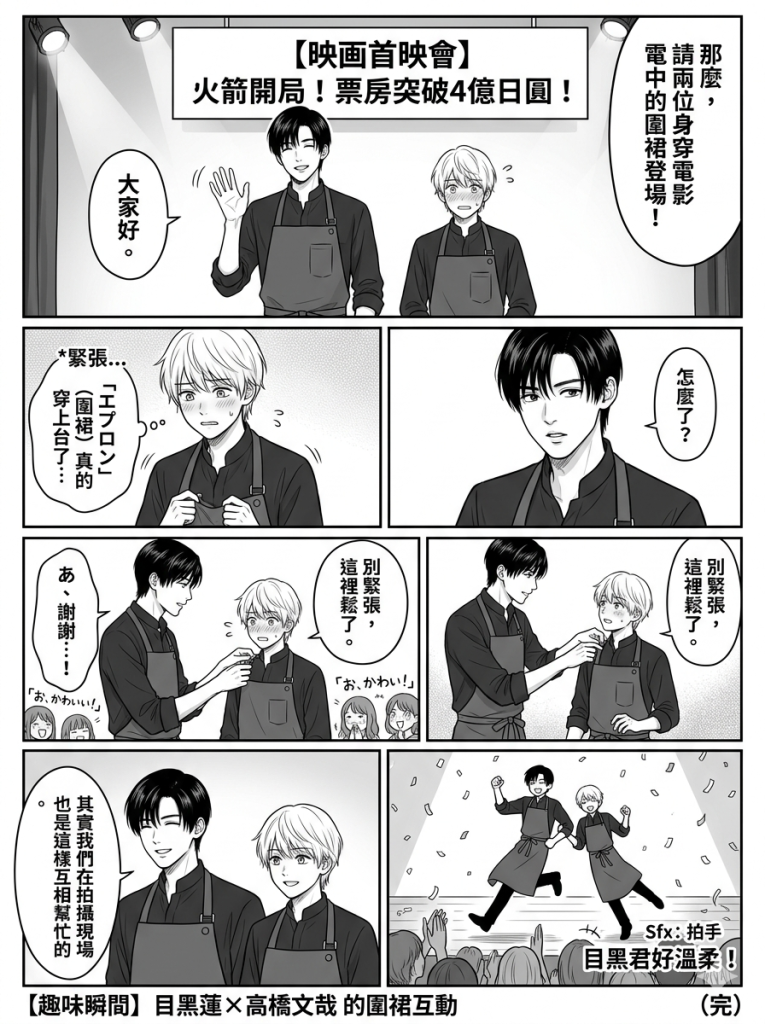 活動的一大亮點是目黑蓮與高橋文哉配合電影劇情,特別換上在戲裡「坂本商店」俐落的「綠圍裙造型」登場,瞬間引發全場尖叫。兩人在台上的互動也展現了拍攝期間培養的好默契。目黑蓮感性表示:「能在首日看到這麼多觀眾走進戲院,對演員來說就是最大的回饋。」高橋文哉也分享了拍攝期間目黑蓮對細節的專注與照顧,現場氣氛既熱鬧又溫馨。