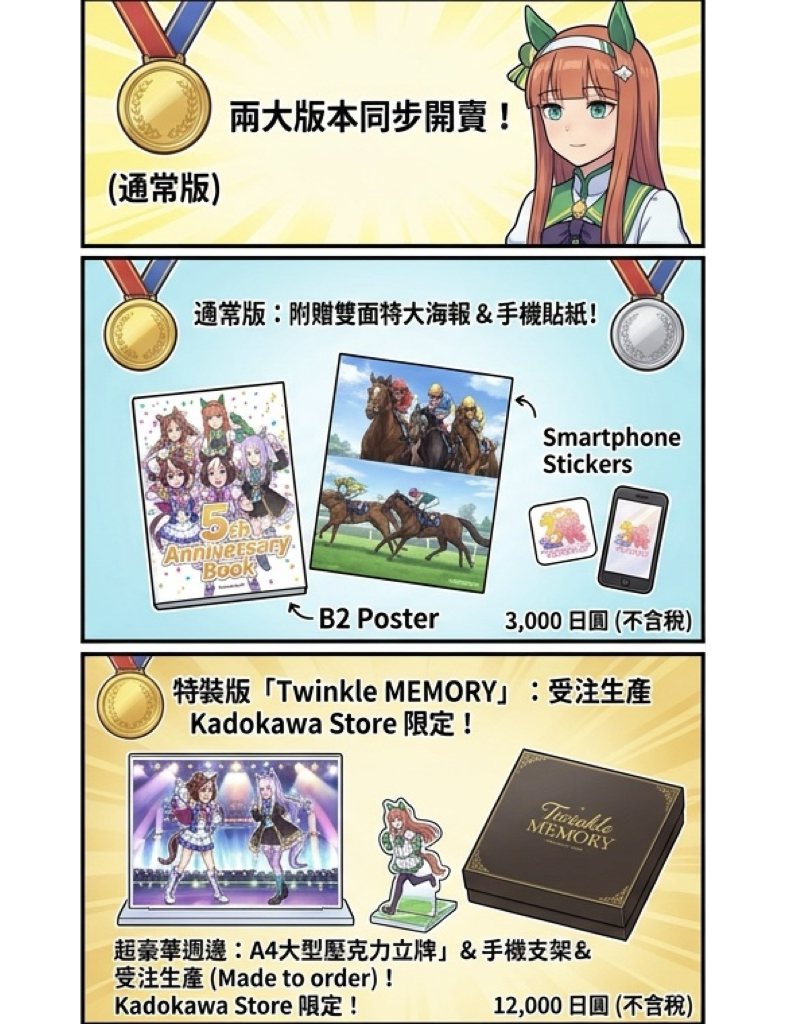 本次販售分為兩種版本:通常版售價 3,000 日圓(不含稅),隨書附贈雙面特大海報與手機貼紙;特裝版「Twinkle MEMORY」售價 12,000 日圓(不含稅),採 Kadokawa Store 限定受注生產,預購僅至 5 月 24 日止。特裝版除了書籍,更包含 A4 大型壓克力立牌、手機支架及專屬收納盒等豪華週邊。兩版本皆內含應募券,可參加本企劃獨家的「馬耳連帽衫與 T 恤套組」購入服務,是訓練員們絕對不可錯過的五週年殿堂級收藏。