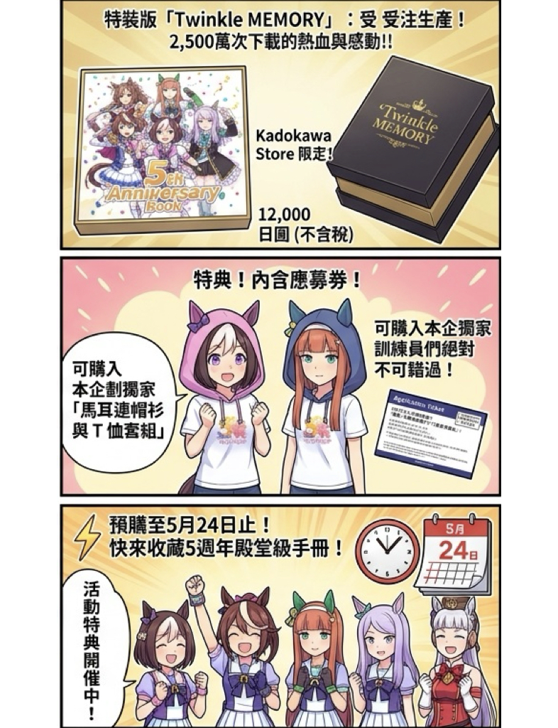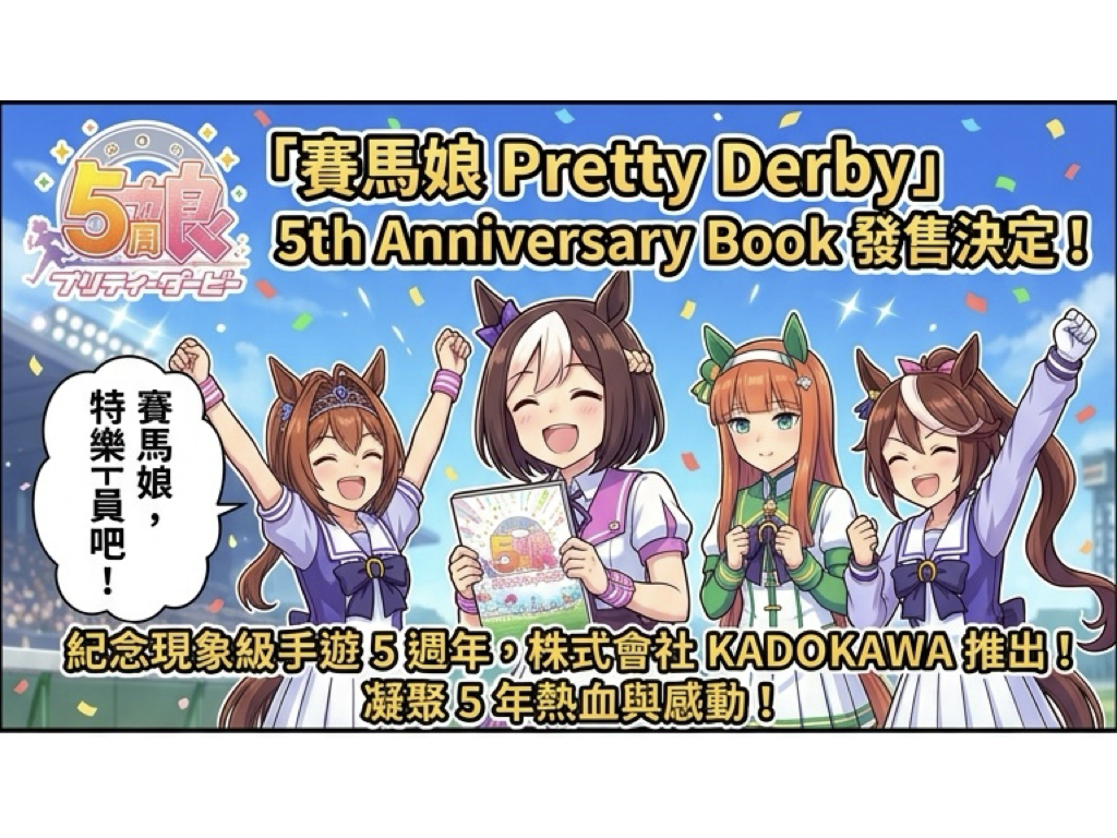 為慶祝現象級手遊《賽馬娘 Pretty Derby》發行屆滿五週年,株式會社 KADOKAWA 宣布正式推出《賽馬娘 Pretty Derby 5th Anniversary Book》。這本珍貴的紀念手冊將收錄 5 年來的發展年表、全 48 首演唱會曲目評論,以及高達 35 頁的聲優與主創深度訪談。除了 A4 尺寸、96 頁的精彩內容外,封面更採用全新繪製插畫,完整濃縮 2,500 萬次下載背後的熱血與感動。