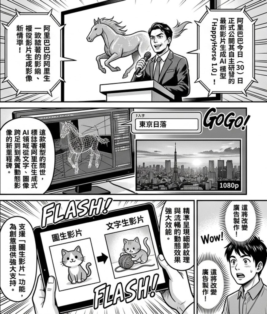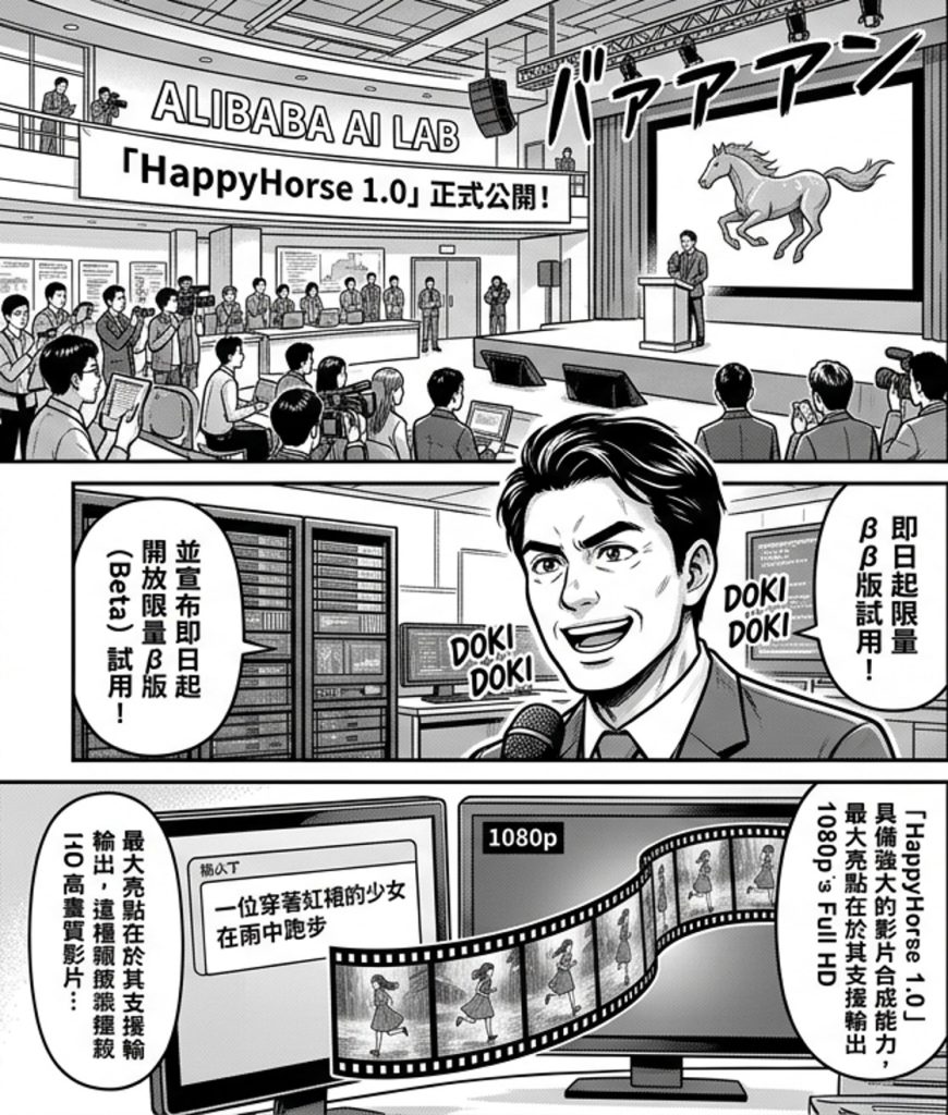 阿里巴巴昨(30)日正式公開其自主研發的最新影片生成 AI 模型「HappyHorse 1.0」,並宣布即日起開放限量β版(Beta)試用。這款模型的問世,標誌著阿里在生成式 AI 領域從文字、圖像跨足到高品質動態影像的新里程碑。
