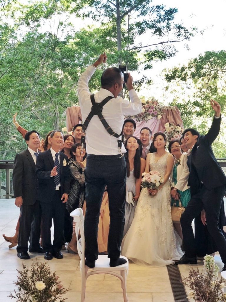 他形容,拍婚紗如同打高爾夫球,旨在靜態中考驗組織能力,將動作與場景細膩的融合;而拍婚禮則像打棒球,隨時會出現雙殺,滾地球的精采瞬間,預判與站位更加重要,才能將時間凍結於霎那。
