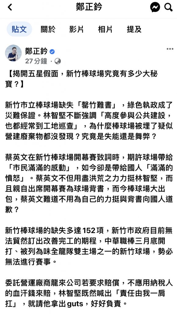原始新聞來源 揭開五星假面 鄭正鈐:新竹棒球場究竟有多少大秘寶? 臺灣郵報.