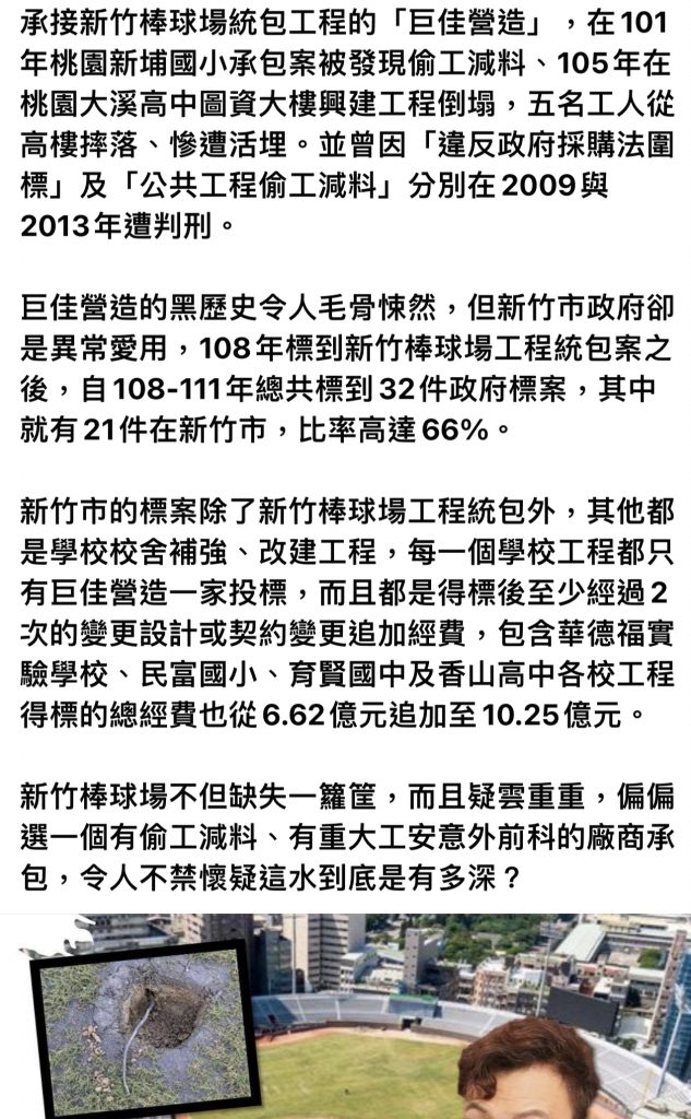 新竹棒球場不但缺失一籮筐,而且疑雲重重,偏偏選一個有偷工減料、有重大工安意外前科的廠商承包,令人不禁懷疑這水到底是有多深?』